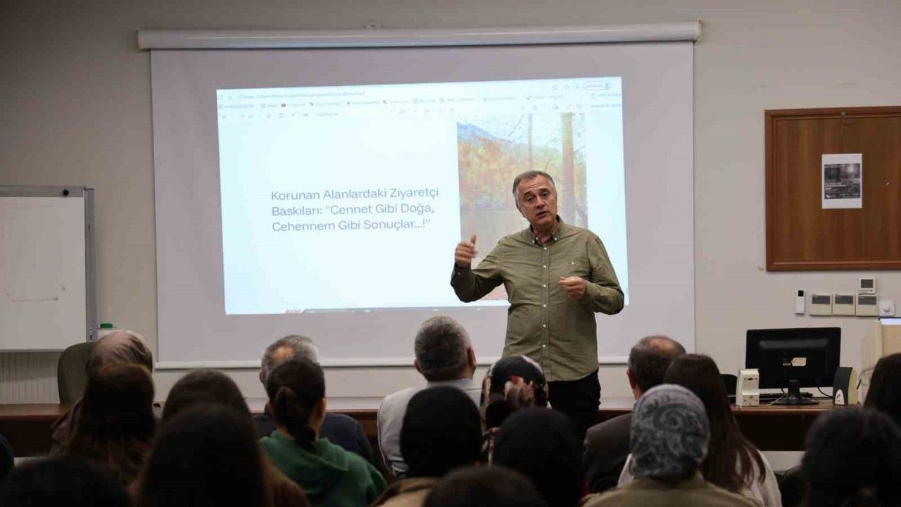 Programın davetli konuşmacısı Düzce Üniversitesi Orman Fakültesi Öğretim Üyesi Prof. Dr. Haldun Müderrisoğlu, "Korunan Alanlardaki Ziyaretçi Baskıları-Cennet Gibi Doğa Cehennem Gibi Sonuçlar" başlıklı sunumunda; Türkiye’de korunan alanlar, koruma alanlarında zonlama, erozyon ve toprak kayıpları, istilacı türler ve korunan alanların planlanması ve korunma yöntemleri gibi konulara değindi.