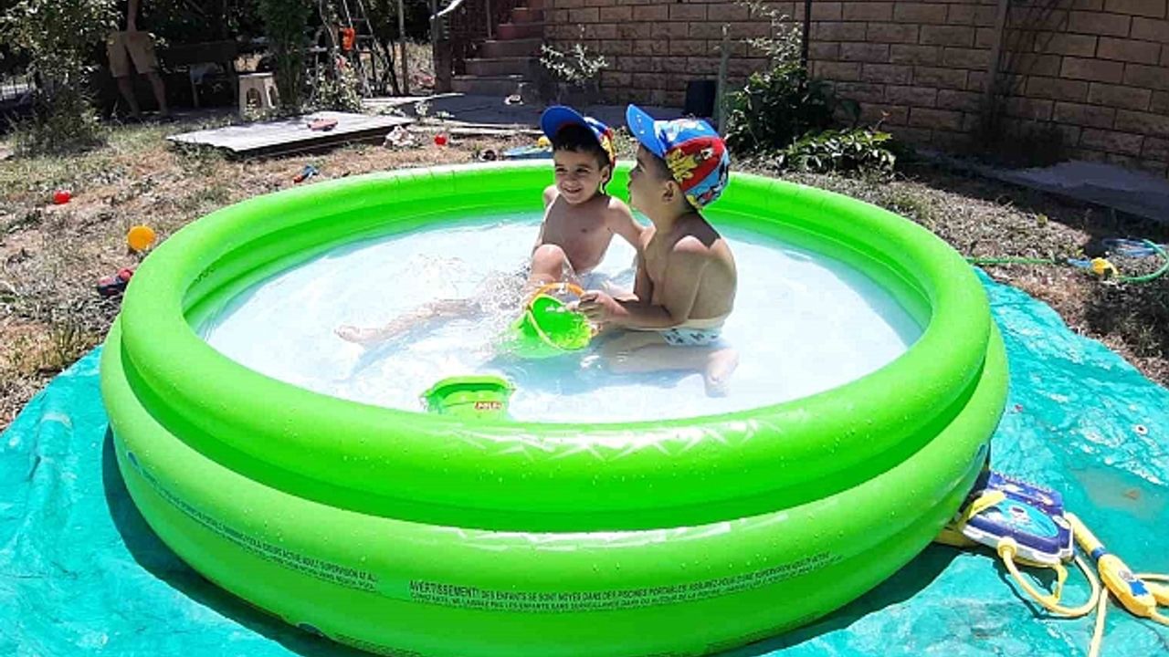 Bolu''nun Mudurnu ilçesine bağlı Yazılar köyünde sıcaklardan bunalan çocuklar ailesinin yardımıyla bahçeye kurulan havuzda serinledi. Ülker ailesinin çocukları 3 yaşındaki Ege ve 4 yaşındaki Rüzgâr, küçük havuzda eğlenceli vakit geçirdi. Doyasıya eğlenen ve serinlemenin keyfini çıkaran çocuklar birbirleriyle su savaşı yaptı.