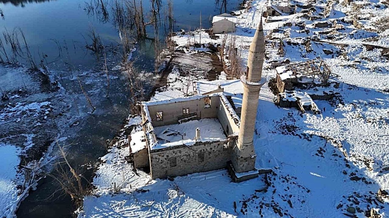 Sivas''ta 2006 yılında inşaatına başlanan ve 2010 yılında tamamen su tutan Pusat Barajında kurak geçen yaz aylarının ardından sular çekildi. Çekilen sularla birlikte gün yüzüne çıkan eski Pusat köyü, 14 yıl sonra kar altında kaldı.