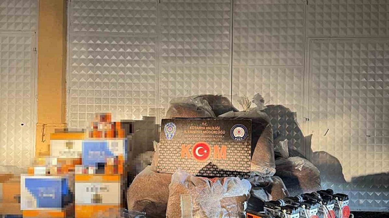 Kütahya''da polis ekiplerince bir depoya düzenlenen baskında, 138 bin 600 adet makaron, 610,3 kilogram tütün ile 3 adet sigara sarma makinesi ele geçirildi.