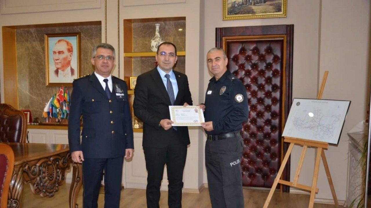 Komiser Yardımcısı Mustafa Akarsu, geçtiğimiz günlerde bir çatı katından kendini atmak üzere olan bir vatandaşı başarılı bir şekilde ikna ederek ve kritik bir müdahaleyle kurtararak büyük bir faciayı engellemişti. Bu fedakâr ve başarılı hizmeti dolayısıyla Kaymakam Özdemir tarafından onurlandırıldı.