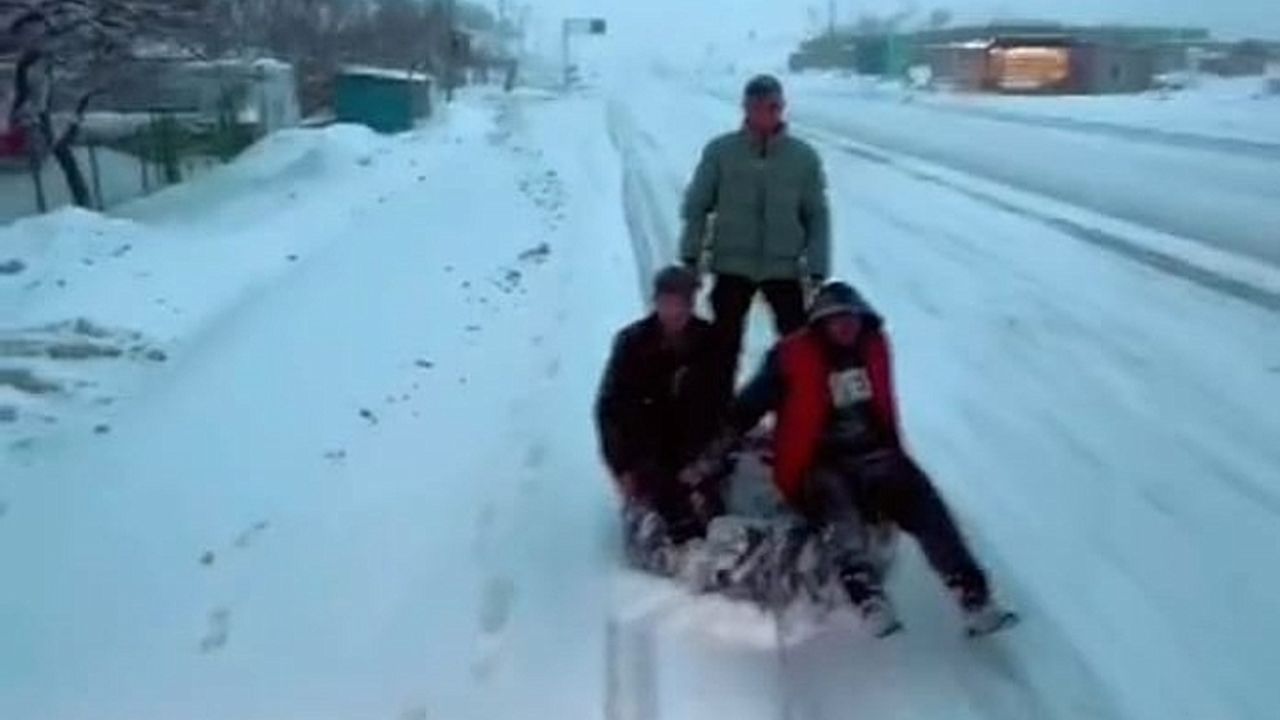 Malatya''nın Akçadağ ilçesinde traktörün arkasına bağlanan lastik üzerinde karda ''sörf'' yapan gençler, hem eğlenceli hem de tehlikeli anlar yaşadı.