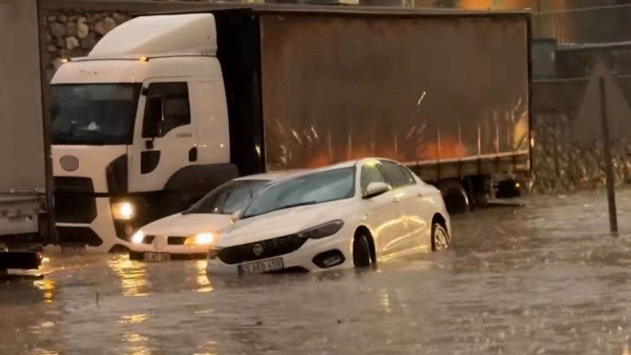 Manisa"nın Turgutlu ilçesinde akşam saatlerinde etkili olan sağanak caddeleri göle çevirdi, bazı araçlar yolda kaldı.