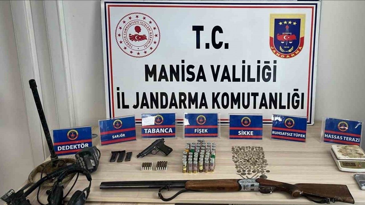 Manisa’nın Salihli ilçesinde jandarma ekiplerince düzenlenen operasyonda çok sayıda tarihi eser, ruhsatsız silah ve dedektör ele geçirildi.