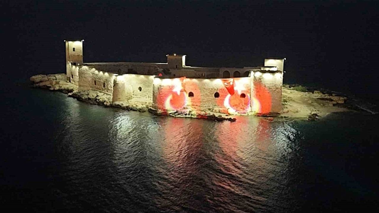 Mersin Erdemli''de bulunan şehrin şimgesi Kızkalesi, Cumhurbaşkanı Erdoğan''ın ''Terörsüz Türkiye'' çağrısıyla birlikte ''Ay yıldızla'' aydınlatıldı.