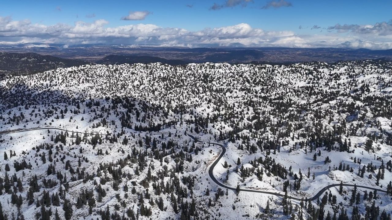Mersin Anamur ilçesinde yüksek rakımlarda ormanlar karla kaplandı, bölge dronla havadan görüntülenirken ortaya kartpostallık görseller çıktı.