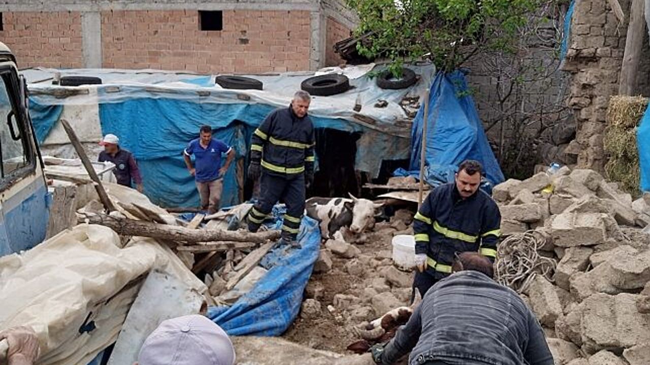 Amasya''nın Merzifon ilçesinde kerpiçten yapılan ahırın tavanı çöktü. Ahırın içinde göçük altında kalan 2 büyükbaş hayvanı itfaiyeciler kurtardı.