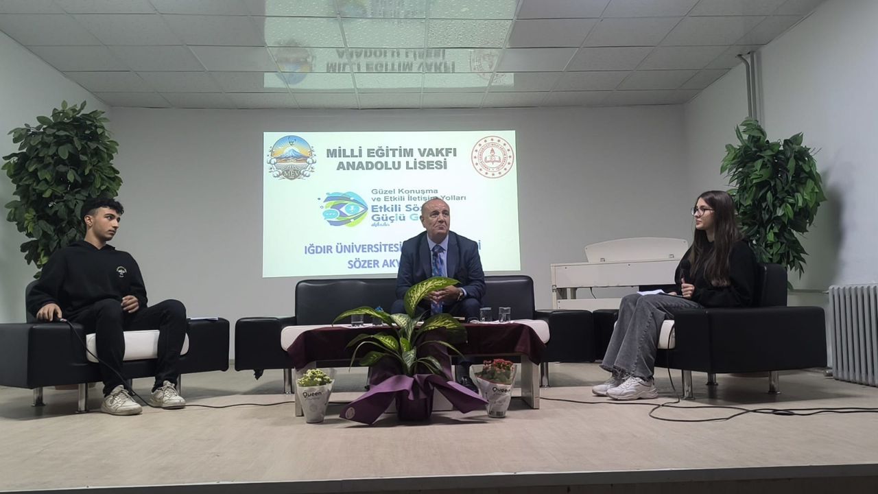 Okul Müdürü Ekber Acar ve Okulun proje koordinatörleri Fuat Başaran ve Fatih Yaray’ın öncülüğünde hazırlanan programda, Akyıldırım; etkili iletişimin temel unsurlarını, nefes kontrolünün konuşmadaki rolünü, ses–tonlama tekniklerini ve vurgu kullanımını uygulamalı örneklerle anlattı. Öğrencilere beden dilinin iletişimdeki gücünü aktaran Akyıldırım, sahne korkusunun nasıl yönetilebileceğine dair pratik yöntemler de paylaştı.