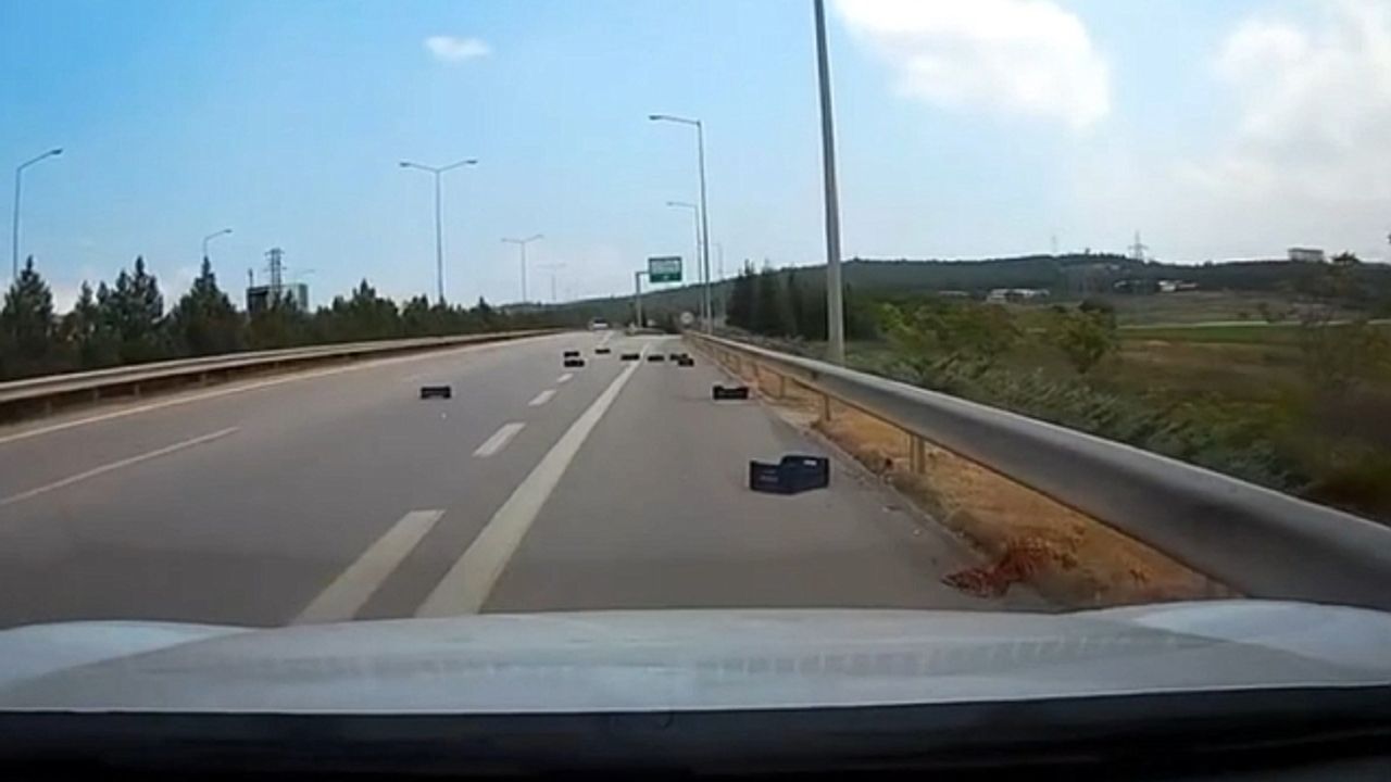 Olay, merkez Nilüfer ilçesi Çevre Yolu Görükle bağlantısında meydana geldi. Seyir halindeki kamyonetin kasa kısmında bulunan meyve sebze kasaları yola saçıldı. Aracı hemen yol kenarına çeken sürücü kasaları toplayarak yoluna devam etti. Kamyonetin arkasından giden aracın kamerası o anları kaydetti.
