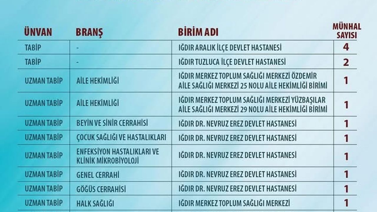 Tahsis edilen hekim kadrolarının, başta Iğdır Dr. Nevruz Erez Devlet Hastanesi olmak üzere Aralık ve Tuzluca İlçe Devlet Hastaneleri ile toplum sağlığı merkezlerinde görev yapacağı bildirildi.