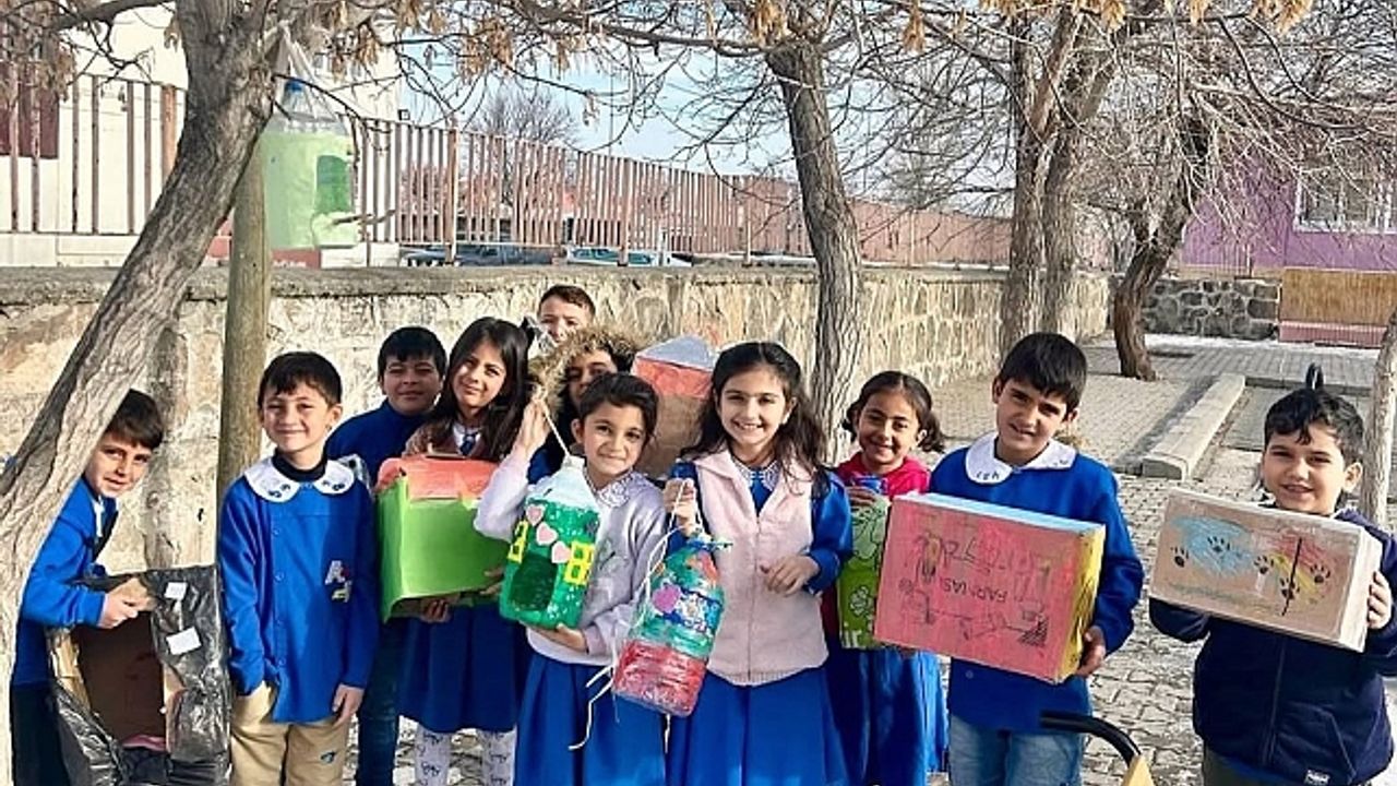 14 Nisan İlkokulunda öğrenim gören 7-10 yaş arası öğrenciler, kuşların üşümemesi için tamamen atık malzemelerle yaptıkları yuvaları okul bahçesinde bulunan ağaçlara astı.