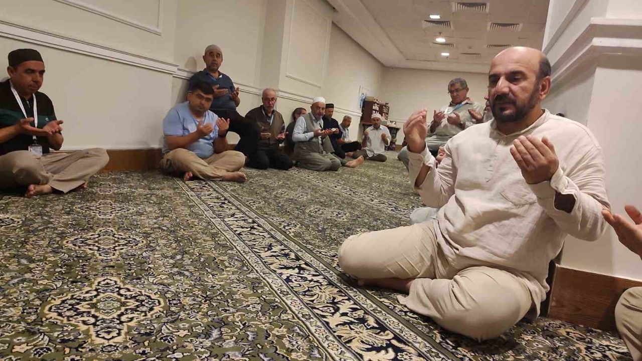 Umre ibadeti için kutsal topraklarda bulunan Türk umreci kafileleri, Miraç kandili dolayısıyla kaldıkları otelin mescidinde Türkiye'den gönderilen ve umreciler tarafından okunan hatimler için toplu dua programı düzenledi.