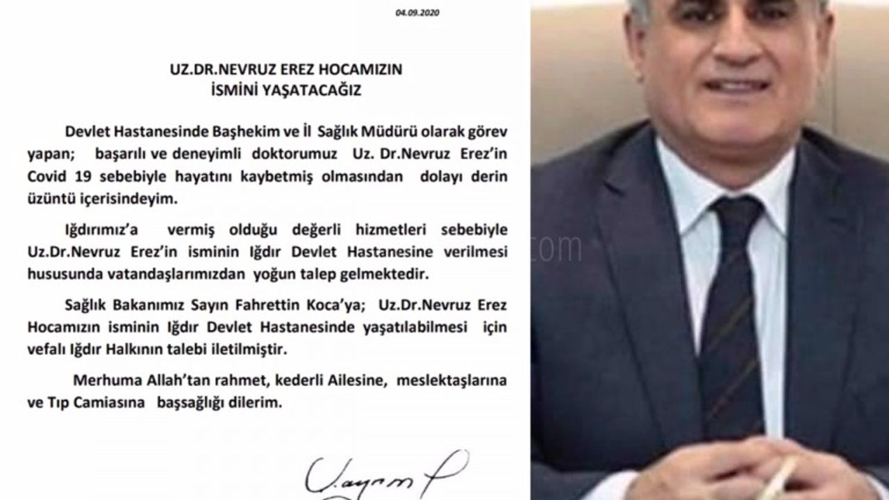 Yıllarca Iğdır"da doktorluk, Başhekimlik ve son olarak da İl Sağlık Müdürlüğü yapan Op. Dr. Nevruz Erez Covid-19 hastalığına yenik düşerek hayatını kaybetmişti.