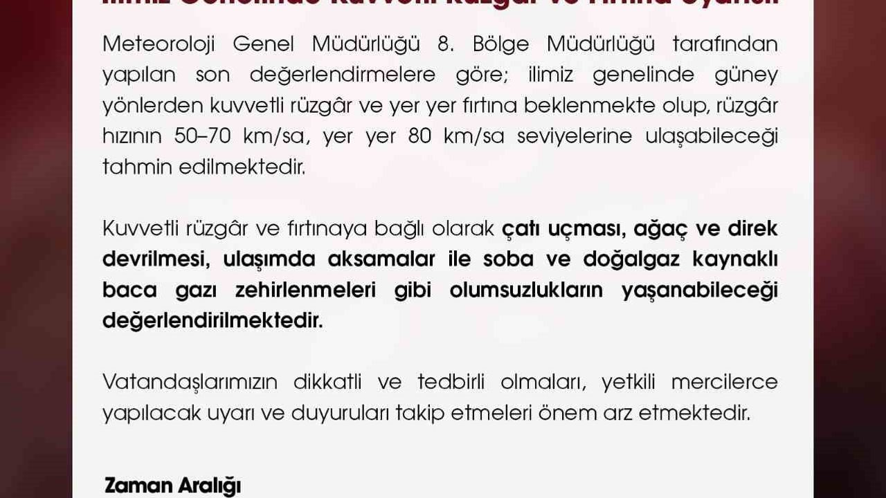 Niğde Valiliği; Meteoroloji Genel Müdürlüğü 8. Bölge Müdürlüğü tarafından yapılan son değerlendirmelere dayanarak il genelinde kuvvetli rüzgar ve yer yer fırtına beklendiğini duyurdu.