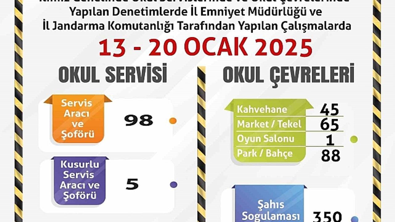 Edinilen bilgilere göre, Eskişehir İl Emniyet Müdürlüğü ve İl Jandarma Komutanlığı ekiplerince okul servislerinde ve çevrelerinde denetim yapıldı. İl genelinde 13-20 Ocak 2025 tarihleri arasında gerçekleştirilen çalışmalarda 81 servis aracı ve şoförü denetlenirken, 5 aracın kusurlu olduğu tespit edildi. Okul çevrelerinde ise 45 kahvehane, 65 market/tekel, 1 oyun salonu ve 88 park/bahçe kontrol edildi. Ayrıca 350 şahsa kimlik sorgusu yapıldığı öğrenildi.