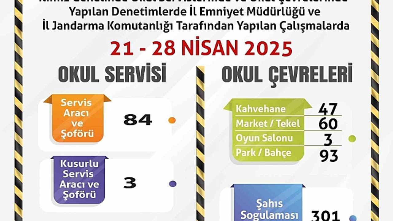 Edinilen bilgilere göre, İl Emniyet Müdürlüğü ve İl Jandarma Komutanlığı ekiplerince okul servisleri ile okul çevrelerinde yapılan denetimler sürüyor. Kent genelinde 21-28 Nisan tarihleri arasında gerçekleştirilen denetimler çerçevesinde, kontrol edilen 84 servis aracından 3''ünün kusurlu olduğu belirlendi. Okul çevrelerinde ise 47 kahvehane, 60 market/tekel, 3 oyun salonu ve 93 park/bahçe olmak üzere toplam 203 farklı mekan denetlendi. Çalışmalar sırasında ekiplerce 301 şahsa kimlik sorgusu yapıldı.