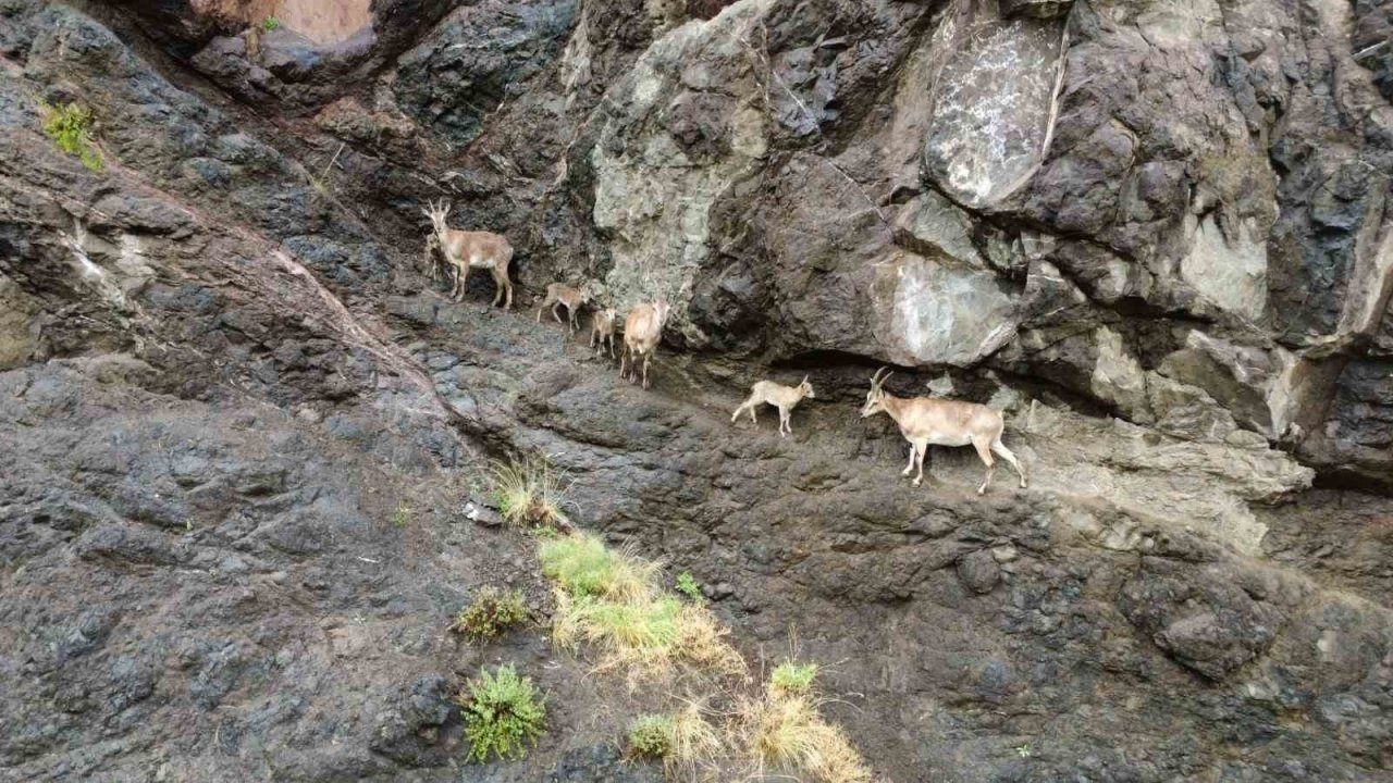 Narman yolu üzerindeki Damlıca Yaban Hayatı Koruma Sahası"nda yaban keçileri görüntülendi. Hem doğaseverlerin dronla kayda aldığı hem de yoldan geçen sürücülerin cep telefonlarıyla çekim yaptığı yaban keçileri, doğal yaşamın güzelliğini bir kez daha gözler önüne serdi.