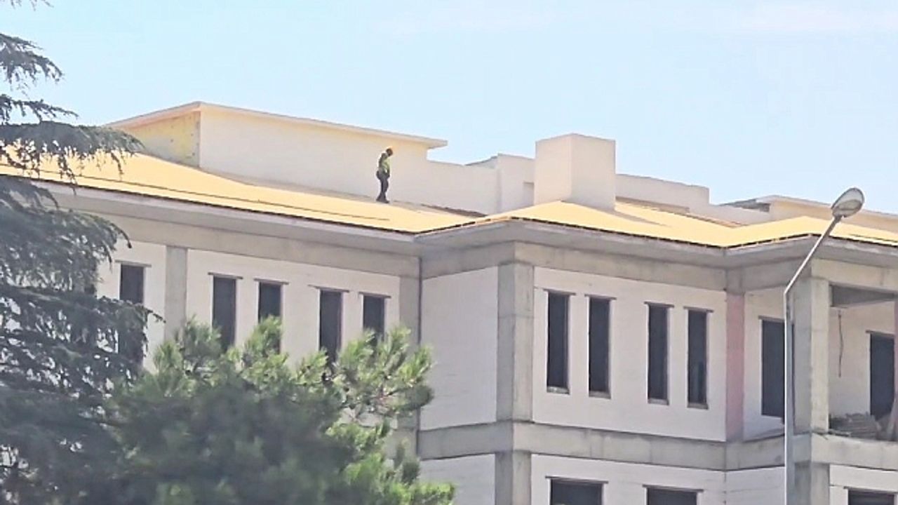 Bilecik merkez Hürriyet Mahallesinde yapımı devam eden yeni Valilik Binası inşaatında sona gelirken, bir işçinin tedbirsiz çalışması yürekleri ağızlara getirdi. 4 katlı binanın çatı katında hiç bir önlem almadan çalışmasına şahit olan vatandaşların yüreklerini ağızlarına getirdi. Normal yolda yürür gibi eğimli çatıda çalışan işçinin bu davranışı adeta ölümle dans ediyor dedirtti.