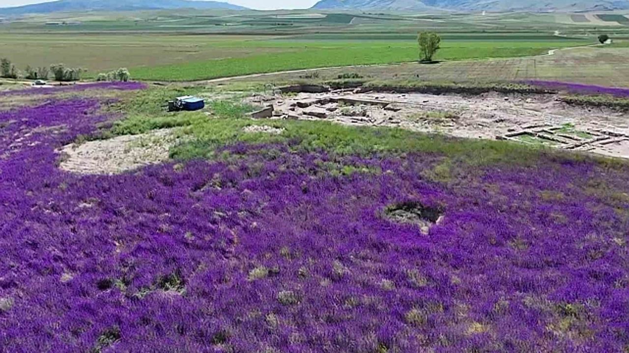 Amasya''daki Oluz Höyük kazı alanını mor çiçekler sardı. Höyükte bu yıl ilk defa karşılaşılan çiçeklerin resitali havadan görüntülendi.