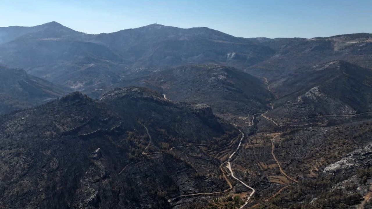 Mersin"in Silifke ilçesinde 3 gün boyunca havadan ve karadan binden fazla personelin müdahalesiyle söndürülen orman yangını sonrasında ortaya çıkan acı manzara havadan görüntülendi.