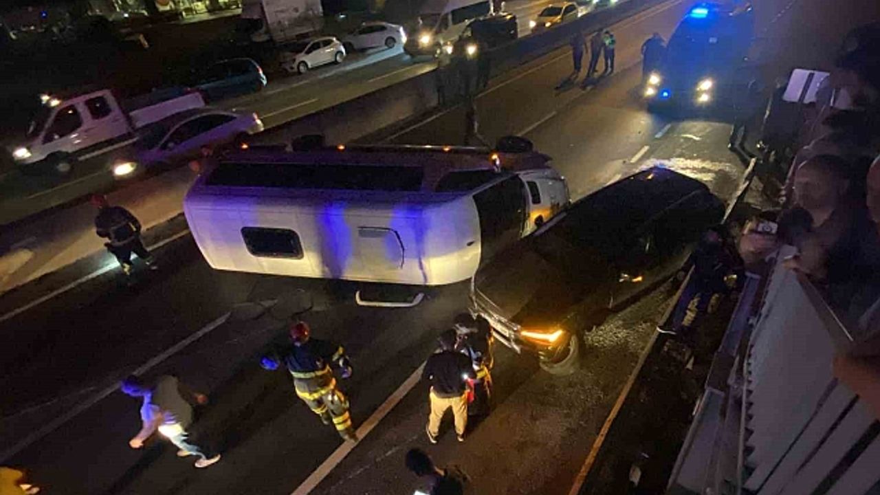 Kocaeli''de otomobil ile çarpışan servis minibüsü devrildi, kazada 5''i işçi toplam 7 kişi yaralandı.