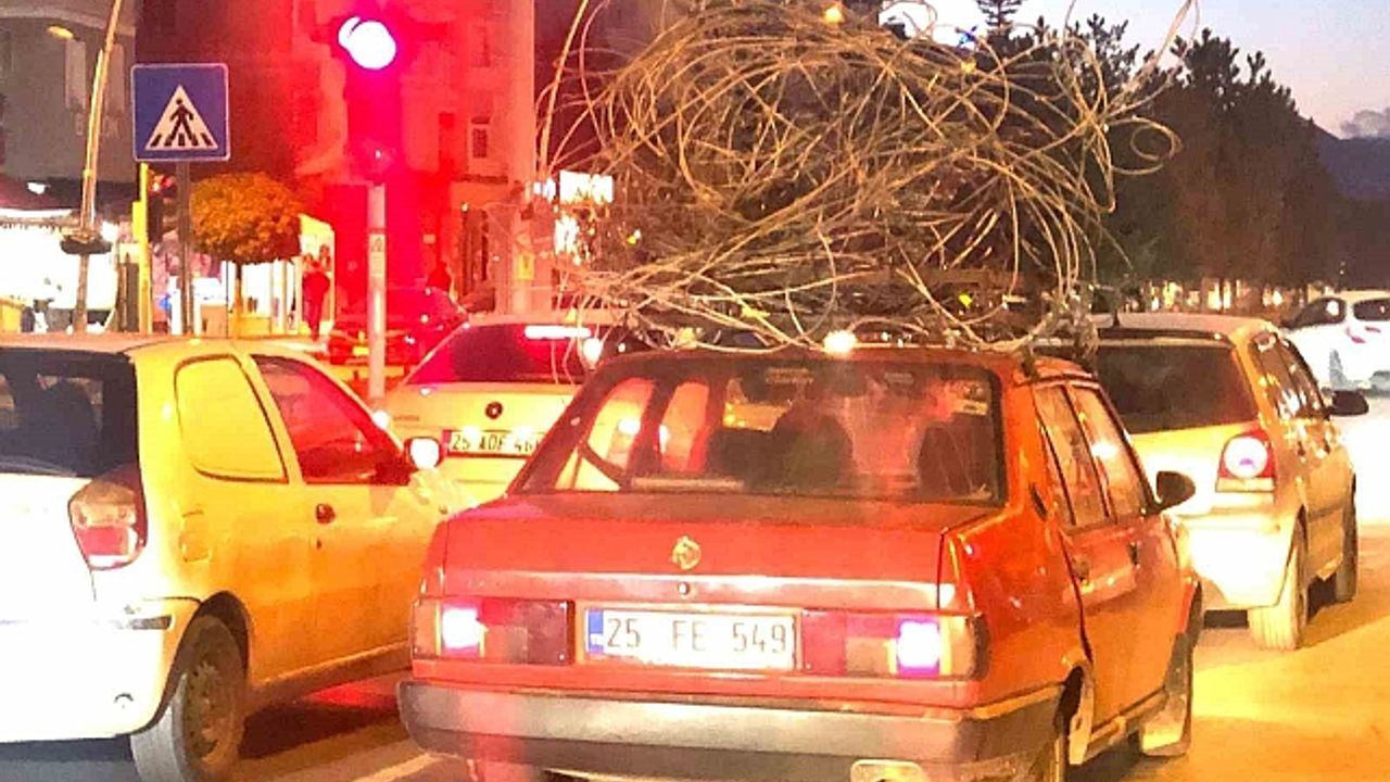 Erzurum''un Aziziye ilçesinde otomobilinin tavanına yüklediği demir yığını ile trafikte ilerleyen sürücü görenleri hayrete düşürdü.
