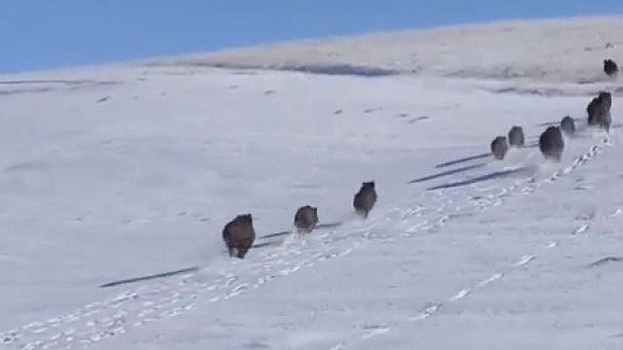 Patnos ilçesi Dedeli köyünden otomobiliyle seyir halindeki vatandaş gündüz saatlerinde yaban domuzu sürüsünün yaklaştığını fark etti. Sayısı 100''ü bulan domuzların korkarak bölgeden uzaklaştığı görülürken, vatandaş cep telefonu ile domuz sürüsünü görüntüledi.