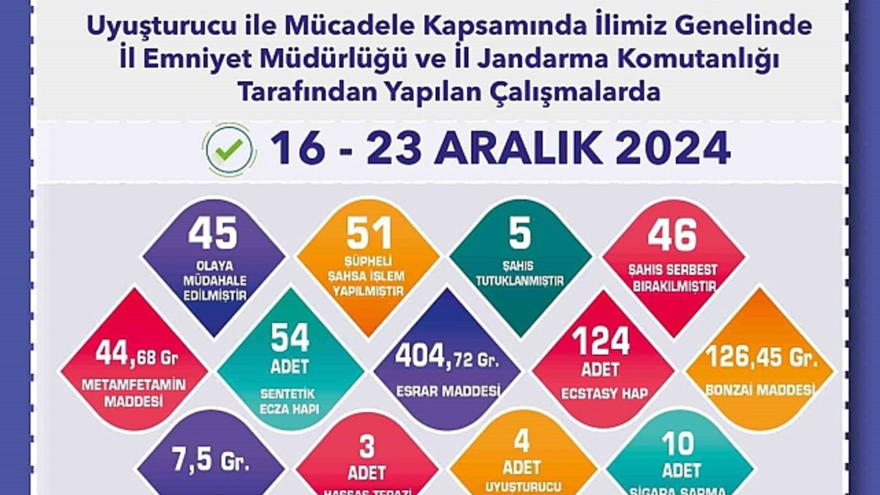 Edinilen bilgilere göre, İl Emniyet Müdürlüğü''ne ve İl Jandarma Komutanlığı''na bağlı ekipler tarafından 16 Aralık ile 23 Aralık tarihleri arasında uyuşturucu madde ile mücadele çerçevesinde 45 ayrı çalışma gerçekleştirildi. Yapılan çalışmalar çerçevesinde 51 kişi gözaltına alınırken, şahıslardan 5''i çıkarıldıkları mahkemece tutuklanarak cezaevine gönderildi. Operasyonlar yapılan aramalarda, 44,68 gram metamfetamin, 54 adet sentetik ecza hapı, 404,72 gram esrar, 124 adet uyuşturucu hap, 126,45 gram bonzai, 7,5 gram eroin, 3 adet hassas terazi, 4 adet uyuşturucu kullanma aparatı ve 10 adet sigara sarma kağıdının ele geçirildiği öğrenildi.
