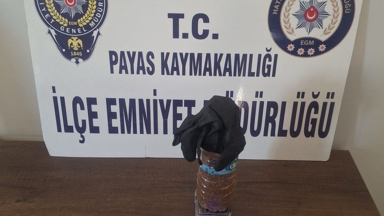 Cumhuriyet Mahallesi üzerinde Payas İlçe Emniyet Müdürlüğüne bağlı ekiplerin devriye görevi esnasında şüpheli A. İ. G. isimli şahıs polisi karşısında görünce şüpheli hareketlerde bulunarak elindeki şeffaf pet su şişesini yol kenarında bulunan bahçeye attı.