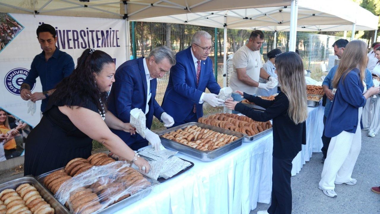Ege Üniversitesinde yeni eğitim-öğretim yılının başlaması üzerine öğrencileri kampüs girişinde karşılayan Rektör Prof. Dr. Necdet Budak, boyoz, gevrek ve çay ikramında bulundu.