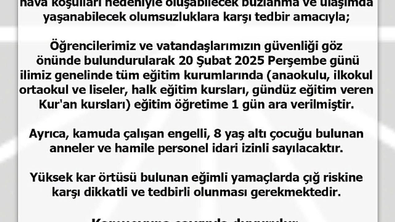 Rize Valiliği tarafından yapılan açıklamada, "İlimiz genelinde devam eden yoğun kar yağışı ve soğuk hava şartları nedeniyle oluşabilecek buzlanma ve ulaşımda yaşanabilecek olumsuzluklara karşı tedbir amacıyla, öğrencilerimiz ve vatandaşlarımızın güvenliği göz önünde bulundurularak 20 Şubat 2025 Perşembe günü ilimiz genelinde tüm eğitim kurumlarında eğitim ve öğretime 1 gün ara verilmiştir" ifadelerine yer verildi.