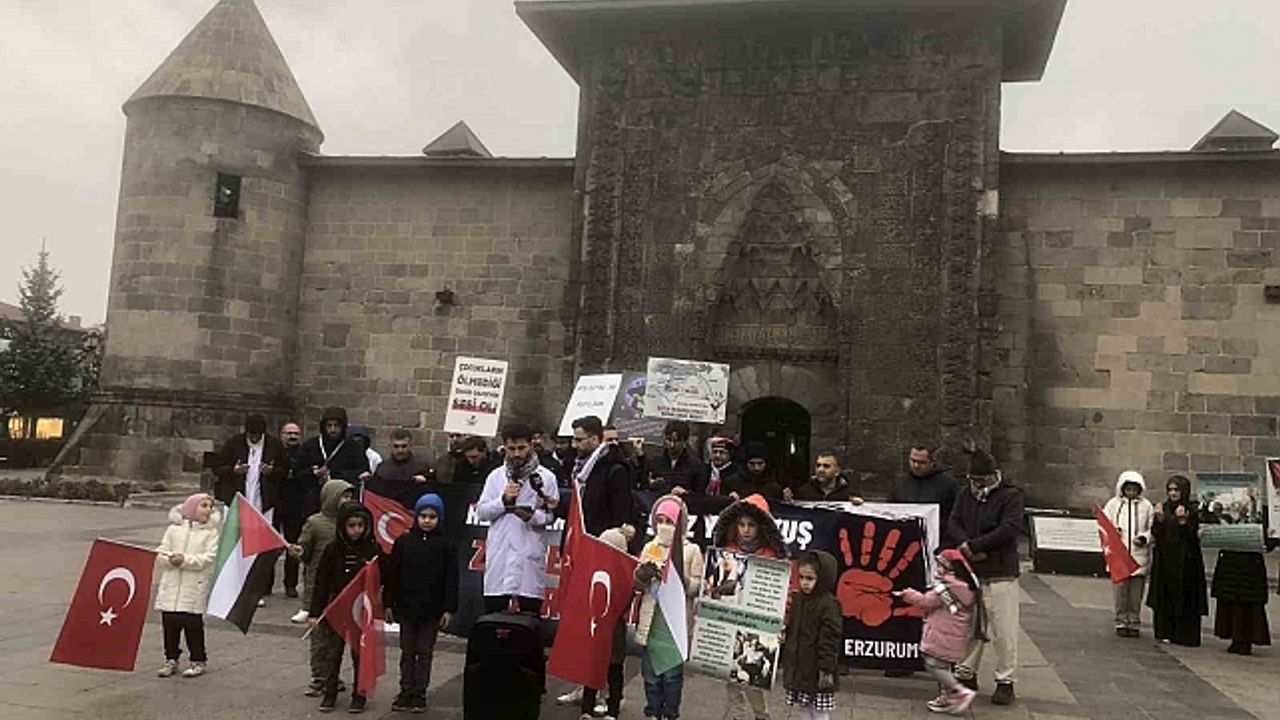 Erzurum Lala Mustafa Paşa Camii avlusunda toplanan sağlık çalışanları, taşıdıkları pankartlarla Yakutiye Medresesi''ne yürüyerek İsrail saldırılarını protesto etti, Filistin halkına destek verdi.