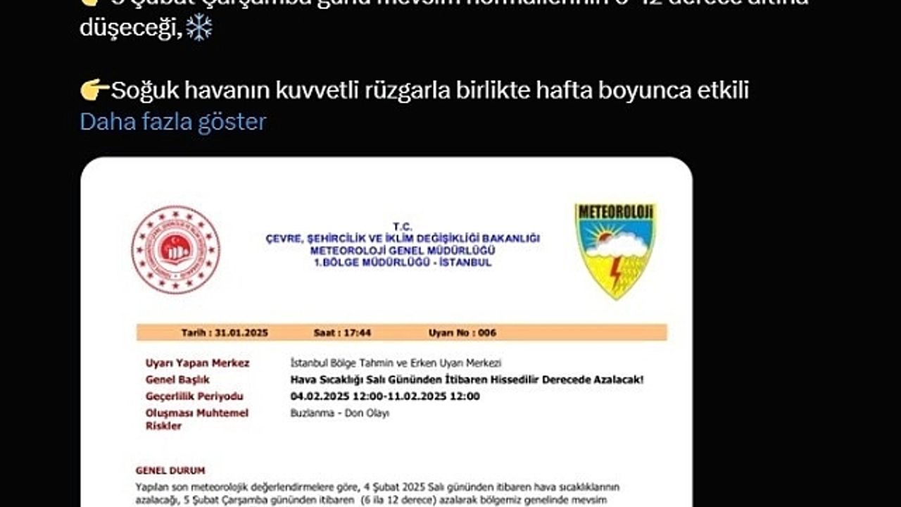 Sakarya Valiliği, meteorolojik verilere göre 4 Şubat Salı gününden itibaren hava sıcaklıklarının azalacağı, 5 Şubat Çarşamba günü ise mevsim normallerinin 6 ila 12 derece altına düşeceği soğuk ve yağışlı havaya karşı uyardı. Valiliğin sosyal medya hesabından yapılan paylaşımda, "Meteoroloji verilerine göre; 4 Şubat Salı gününden itibaren hava sıcaklıklarının azalacağı, 5 Şubat Çarşamba günü mevsim normallerinin 6-12 derece altına düşeceği, soğuk havanın kuvvetli rüzgarla birlikte hafta boyunca etkili olacağı, ayrıca söz konusu periyotta karla karışık yağmur ve kar yağışlarının görüleceği tahmin edilmektedir. Yaşanabilecek olumsuz durumlara karşı dikkatli ve tedbirli olunması gerekmektedir" denildi.