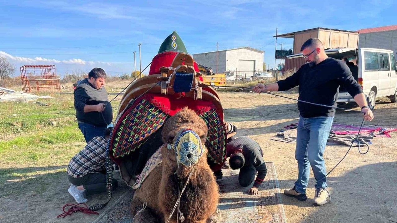Buldan’da deve güreşlerinin başpehlivanlarından İhramcı devesi dualarla havudunu kuşandı.