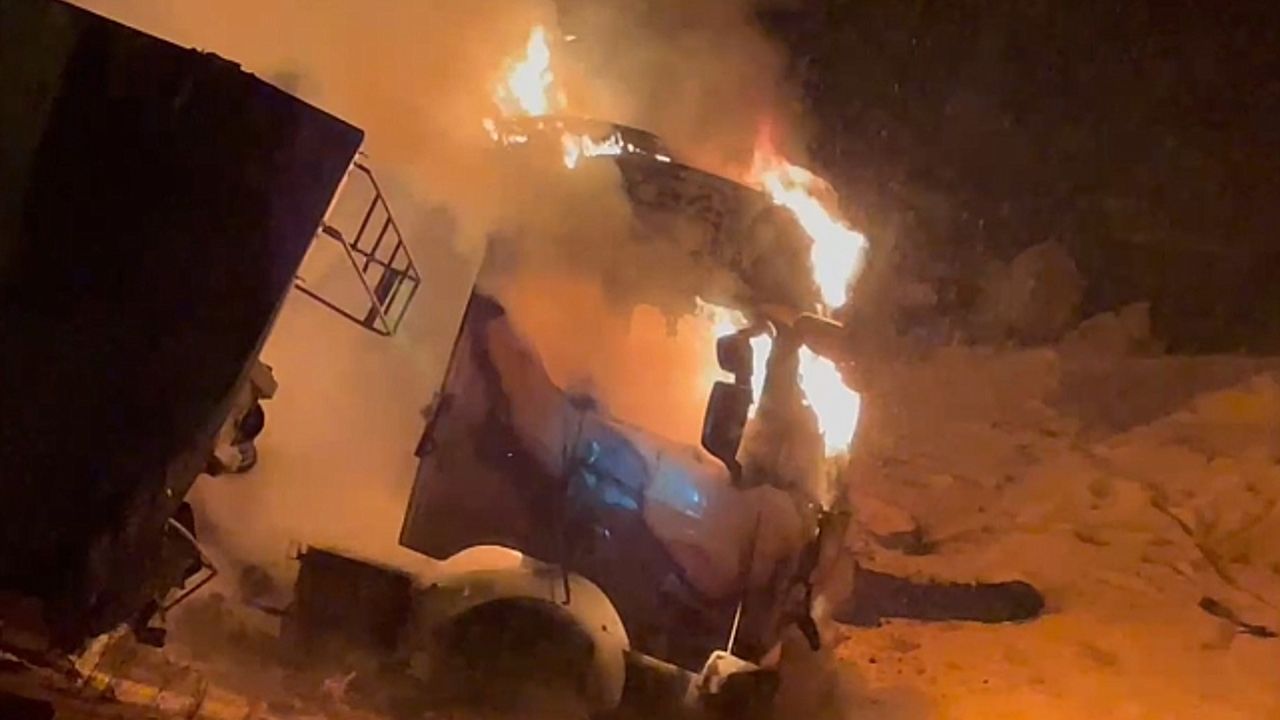 Kars''ın Sarıkamış ilçesinde hafif ticari araçla çarpışan tır, yoldan çıkarak yan yattı. Bir anda alev topuna dönen tırdan çıkan sürücü ise yanmaktan son anda kurtuldu.