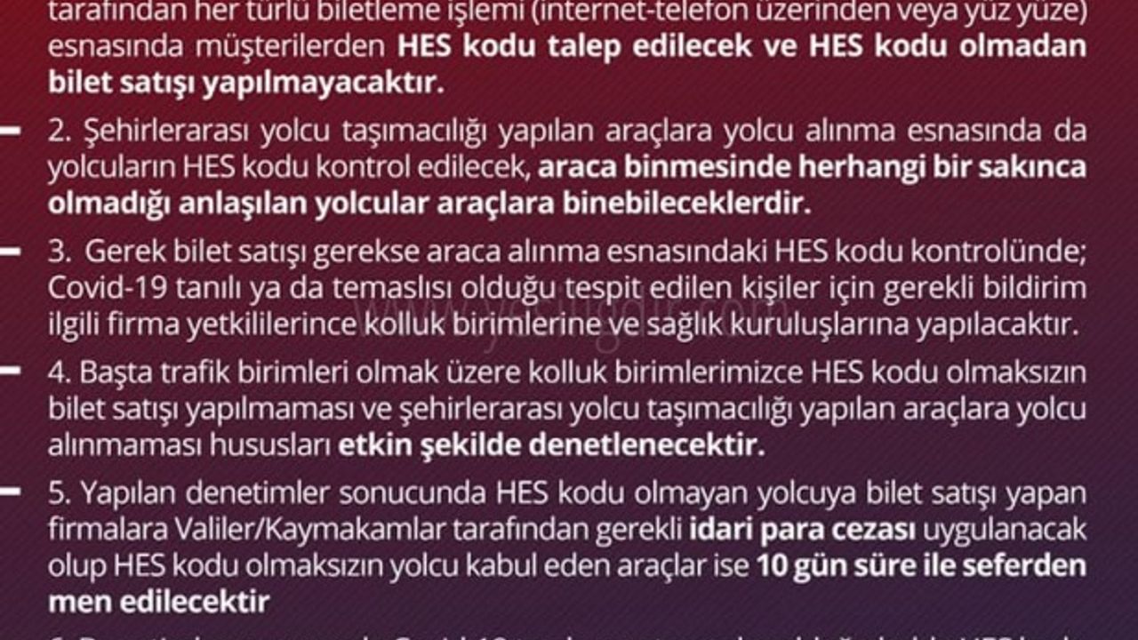 1. Şehirlerarası yolcu taşımacılığı yapan firmalar (otobüs, midibüs, minibüs vb.) tarafından her türlü biletleme işlemi (internet-telefon üzerinden veya yüz yüze) esnasında müşterilerden HES kodu talep edilecek ve HES kodu olmadan bilet satışı yapılmayacaktır. 2. Şehirlerarası yolcu taşımacılığı yapılan araçlara yolcu alınma esnasında da yolcuların HES kodu kontrol edilecek, araca binmesinde herhangi bir sakınca olmadığı anlaşılan yolcular araçlara binebileceklerdir. caktır.