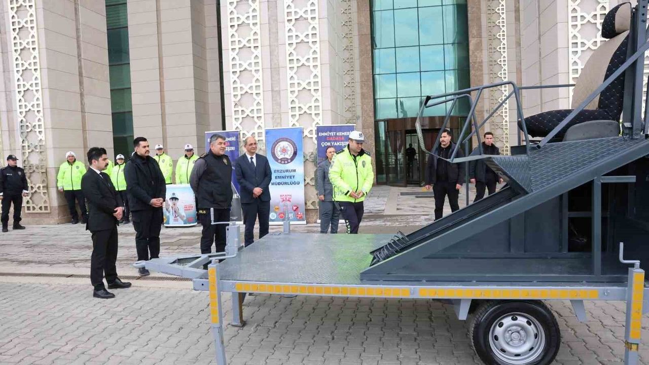 Erzurum İl Emniyet Müdürü Onur Karaburun, Trafik Denetleme Şube Müdürlüğü tarafından emniyet kemeri kullanımının hayati önemine dikkat çekmek amacıyla hazırlanan simülasyon aracını yerinde inceledi.