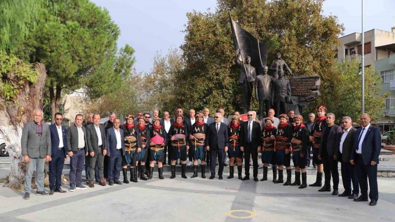 Söke Muhtarlar Derneği çelenginin Atatürk Anıtı’na çelenk sunumuyla başlayan tören, saygı duruşu ve İstiklal Marşı’nın okunmasıyla devam etti.