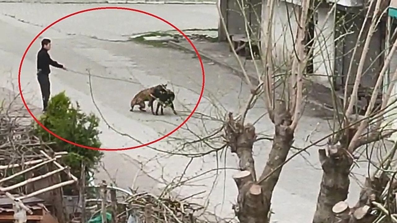 Samsun''un Terme ilçesinde bir şahsın, tasmasından tuttuğu köpeğini, mahallede bulunan sokak köpeklerinin üzerine salarak kavga ettirdiği anlar görüntülendi.