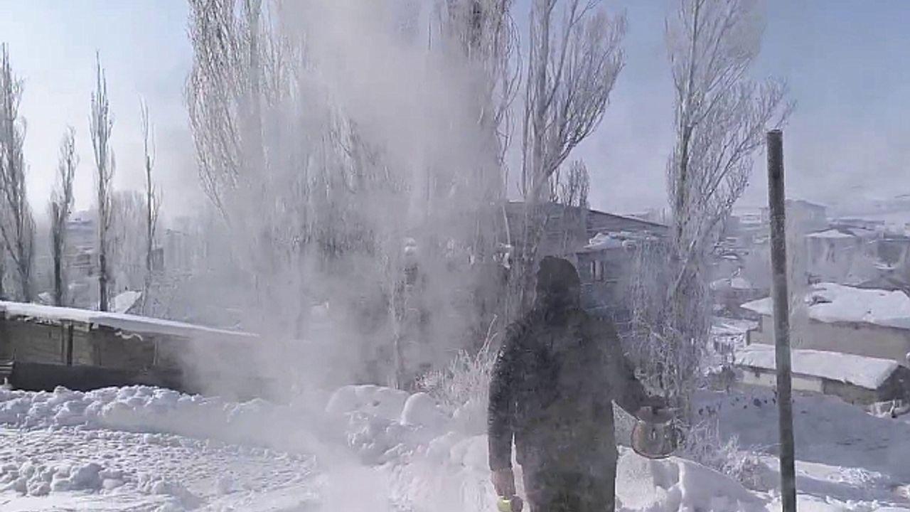 Erzurum''un Tekman ilçesinde havaya atılan sıcak su buz olarak yere düşerken, vatandaşlar soğuk havanın sağlığı tehdit eder boyutta olduğunu belirtti.
