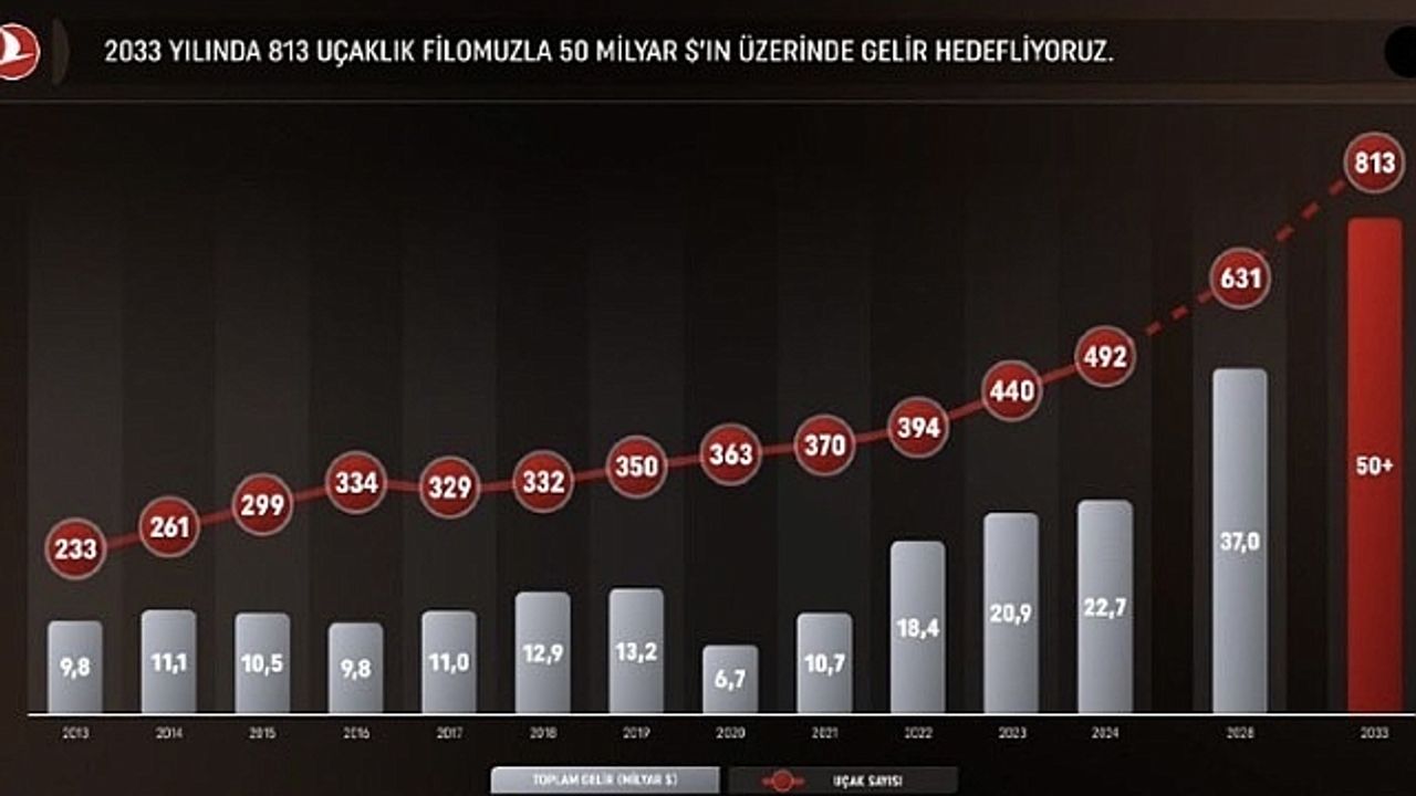 THY Genel Müdürü Bilal Ekşi, sosyal medya üzerinden yaptığı paylaşımda, THY''nin uçak filosuna ve gelirine ilişkin büyümesine ait tabloyu paylaştı. Tabloya göre, THY 2028''de toplam gelirini 37 milyar dolara, uçak sayısını 631''e çıkarmayı, 2033''te ise 813 uçaklık filoyla 50 milyar doların üzerinde gelir hedefliyor.