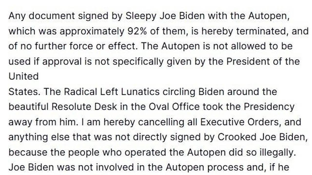 Bu nedenle o dönemde imzalanan tüm resmi belgeleri geçersiz kıldığını söyleyen Trump, "Sahtekar Joe Biden tarafından doğrudan imzalanmamış tüm başkanlık kararnamelerini ve resmi belgeleri iptal ediyorum. Çünkü ‘Autopen’i kullanan kişiler bunu yasadışı bir şekilde yapmıştır" dedi. Biden’ın resmi başkanlık belgelerinin "Autopen" ile imzalandığı sürece dahil olmadığının altını çizen Trump, "Eğer dahil olduğunu söylerse, yalancı şahitlik suçlamasıyla karşı karşıya kalacaktır" uyarısında bulundu.