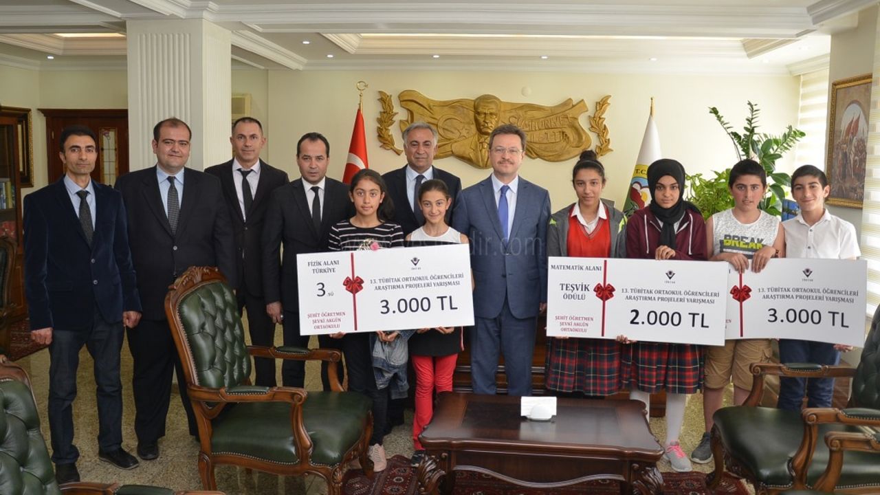 Vali Enver Ünlü, TÜBİTAK Ortaokul Öğrencileri Araştırma Projeleri Yarışmasında dereceye giren öğrencilerimizi makamında ağırladı. Ziyarette İl Milli Eğitim Müdürü Hakan Gönen de hazır bulundu.