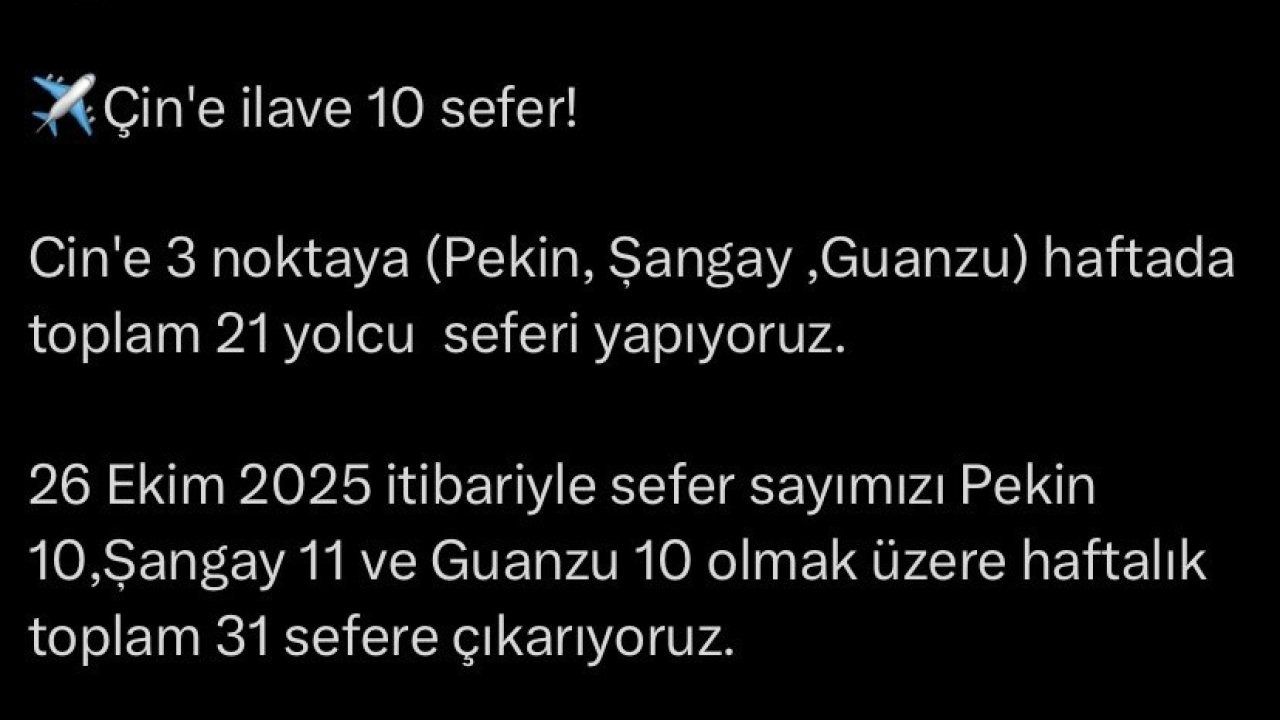 Konuyla ilgili olarak sosyal medya hesabı üzerinden açıklama yapan THY Genel Müdürü Bilal Ekşi, "Çin"e ilave 10 sefer! Cin"e 3 noktaya (Pekin, Şangay, Guanzu) haftada toplam 21 yolcu seferi yapıyoruz. 26 Ekim 2025 itibariyle sefer sayımızı Pekin 10, Şangay 11 ve Guanzu 10 olmak üzere haftalık toplam 31 sefere çıkarıyoruz. Türkiye büyüyor, THY yüksekten uçuyor" dedi.