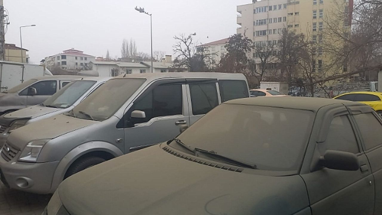 Park halinde bekleyen araçlar tozdan görünmez hale geldi.