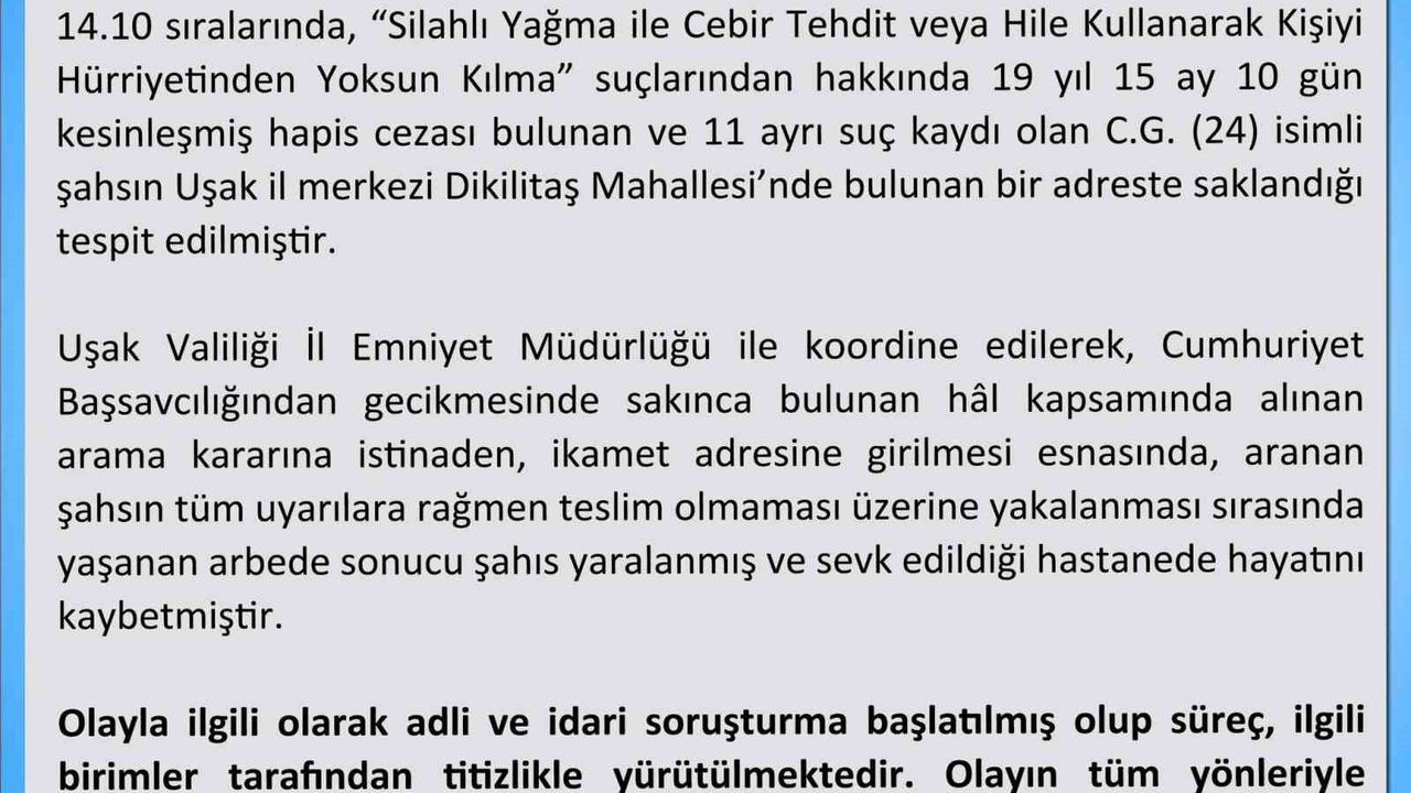 Valiliğin konuya ilişkin yaptığı açıklamada ise; 'Silahlı Yağma ile Cebir Tehdit veya Hile Kullanarak Kişiyi Hürriyetinden Yoksun Kılma' suçlarından hakkında 19 yıl 15 ay 10 gün kesinleşmiş hapis cezası bulunan ve 11 ayrı suç kaydı olan C.G. (24) isimli şahsın Uşak il merkezi Dikilitaş Mahallesi'nde bulunan bir adreste saklandığı tespit edilmiştir. Uşak İl Emniyet Müdürlüğü ile koordine edilerek, Cumhuriyet Başsavcılığından gecikmesinde sakınca bulunan hal kapsamında alınan arama kararına istinaden, ikamet adresine girilmesi esnasında, aranan şahsın tüm uyarılara rağmen teslim olmaması üzerine yakalanması sırasında yaşanan arbede sonucu şahıs yaralanmış ve sevk edildiği hastanede hayatını kaybetmiştir. Olayla ilgili olarak adli ve idari soruşturma başlatılmış olup süreç, ilgili birimler tarafından titizlikle yürütülmektedir. Konunun tüm yönleriyle incelenmesi için İçişleri Bakanımız Sayın Mustafa Çiftçi'nin talimatıyla Mülkiye Başmüfettişi ve Jandarma Genel Komutanlığı Müfettişi görevlendirilmiştir' ifadelerine yer verildi.