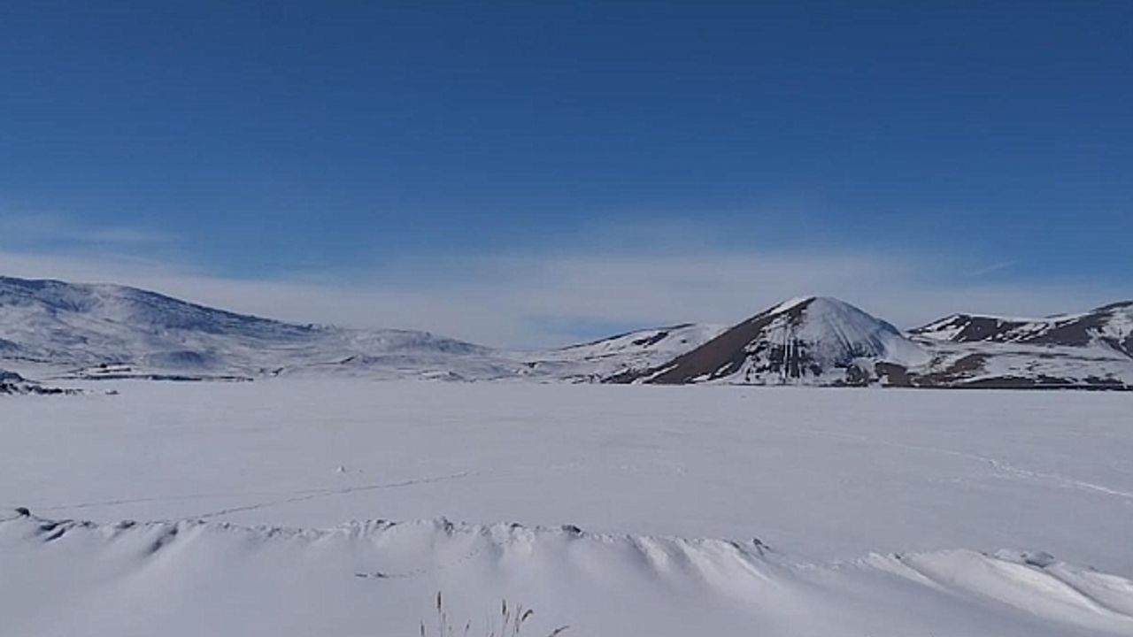 Ağrı''nın Taşlıçay ilçesinde etkili olan kar yağışı sonrası dondurucu soğuklar nedeniyle Türkiye''nin en yüksek rakımlı gölü Balık Gölü, üzeri buz ve karla kaplanınca tamamen gözden kayboldu.