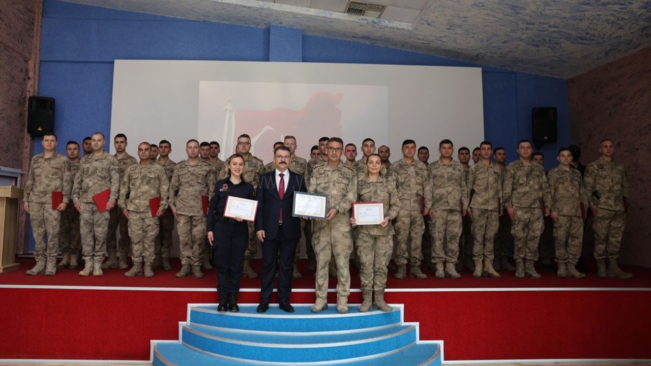 Vali Ercan Turan, İl Jandarma Komutanlığında düzenlenen törende, asayiş ve kamu düzeninin sağlanması ve Cumhuriyetimizin 100"üncü yılı dolayısıyla düzenlenen etkinliklerde gösterdikleri üstün gayret ve özverili çalışmaları nedeniyle İl Jandarma Komutanı Albay Nihat Özkök ve Jandarma personellerine başarı belgelerini takdim etti.