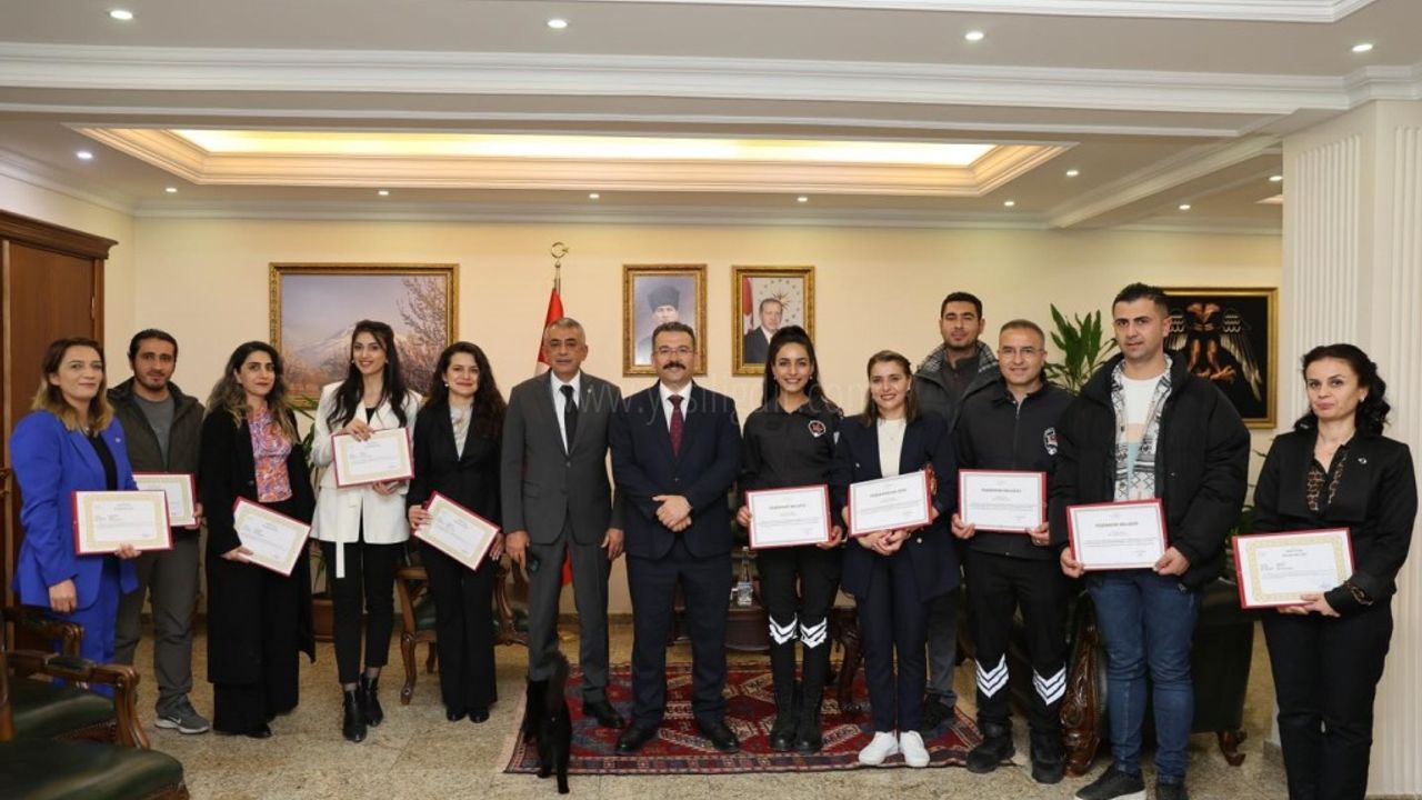 Cumhuriyetimizin 100"üncü yılı dolayısıyla ilimizde düzenlenen etkinliklerde gösterdikleri üstün gayret ve özverili çalışmaları nedeniyle kurum personellerini tebrik eden Vali Turan, başarı ve teşekkür belgelerini takdim etti.
