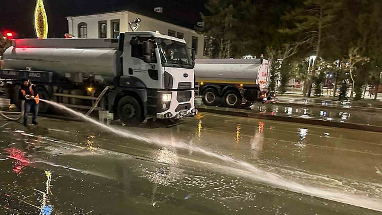 Ardından ekipler basınçlı su ile caddelerde detaylı yıkama işlemi yapıyor.
